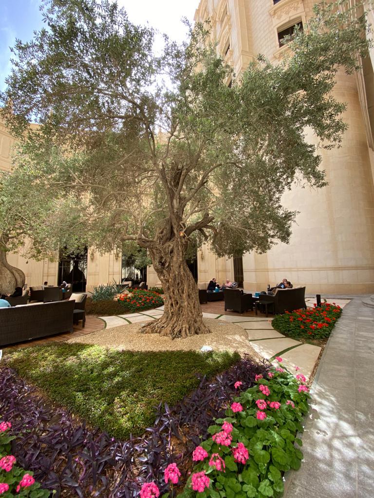 We passed through the grand foyer out into a smaller outdoor cafe garden. We sat and enjoyed the older trees, 600 and 400 years old respectively, and beautifully kept flowers. Our waiter brought a rainbow of juices to us which we had ordered, and we sipped them among soft, relaxing music, wafting from hidden speakers. The blue sky was bordered by the architecture of the place.