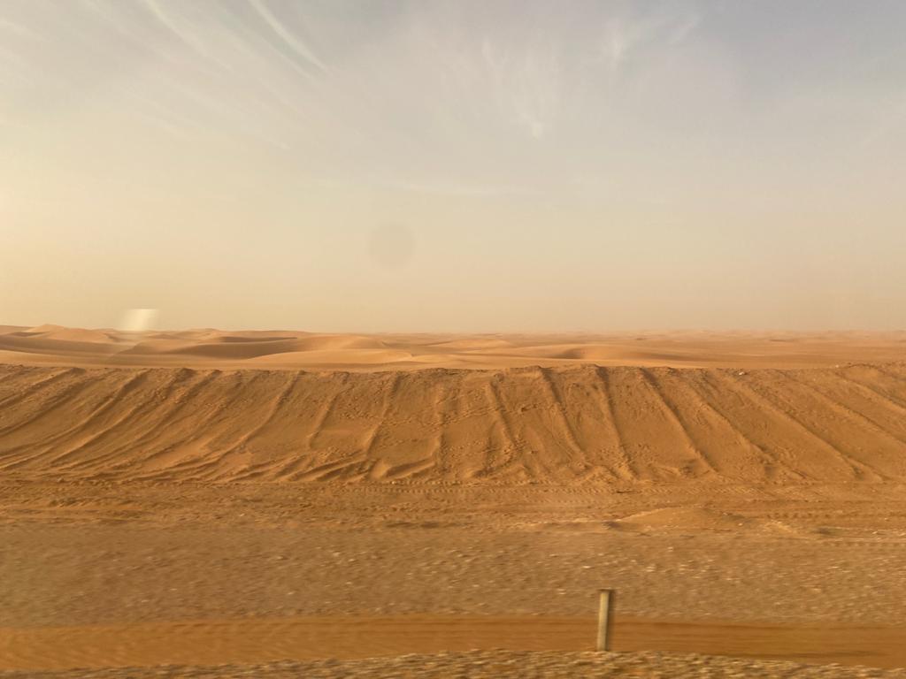 Finally got the video I had taken onboard our recent trip to Riyadh. I can put a few pictures in here, but having a video is even better…it gives you a sense of complete desert surroundings outside the train tracks! It may be meditative to you. The interesting thing to note, is how they keep the tracks from disappearing underneath all the sand. I am amazed really, as all year round there are workers literally operating bulldozers, pushing the sand back about 40 feet or so from either side of the tracks. You will see the “push marks” as perpendicular lines in rows.