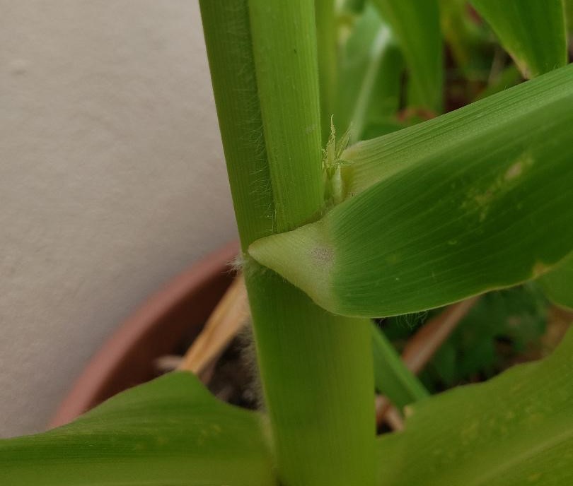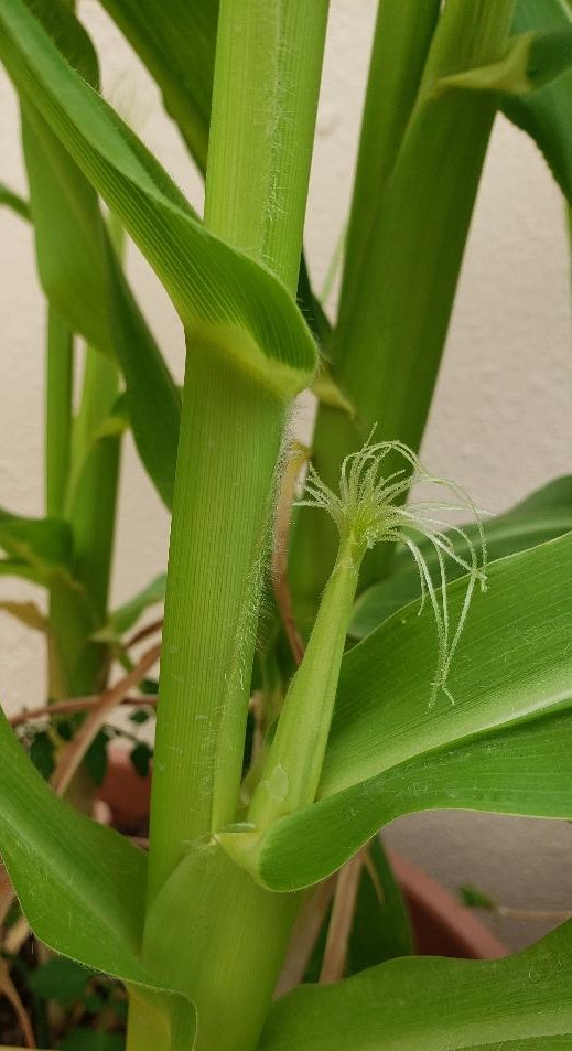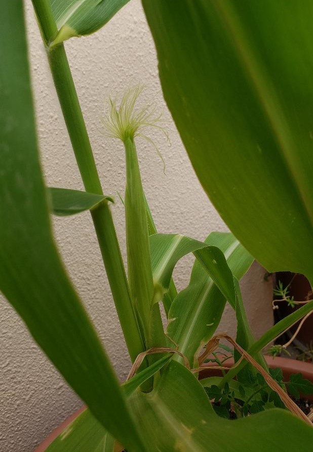 Today we just noticed that we are getting some corn cobs to develop! From the smallest start, to ears almost 3 inches tall, (5 inches in total measuring down into the stalk), this is exciting! We originally planted the seeds in February and they have been growing nicely. We will see how the plants fare over these next weeks, as the temperatures get higher. I had moved the pot into a more protected spot from wind and sun. We are watering the plants everyday, but they do have a few lower leaves that are turning yellow and dying off. I am thinking to monitor that and see if perhaps they are being overwatered. Stay tuned for hopes of more corn development!