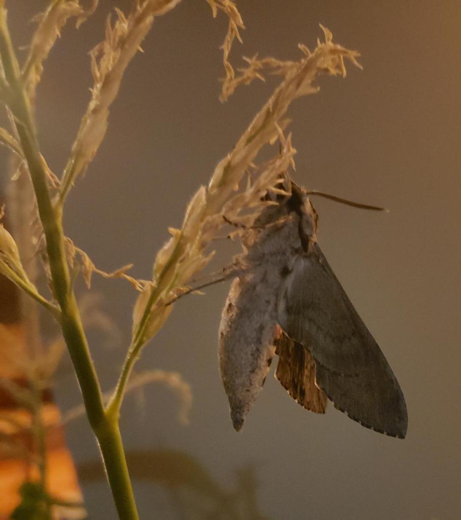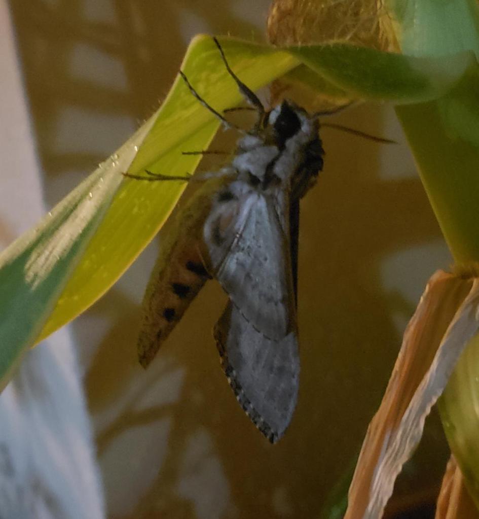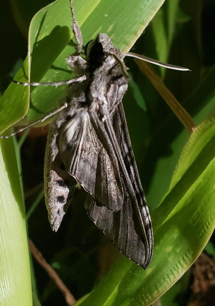 It was a noisy animal, rustling around in the plant debris, so I ran inside to grab my cell phone. Quickly I returned to find it climbing the pot where the corn was growing. It grabbed onto the corn leaves and climbed up under one and hung underneath. It’s large abdomen, dark eye area, and smaller pointy wings seemed furry and soft. The moth just hung there and I took the first pictures below.