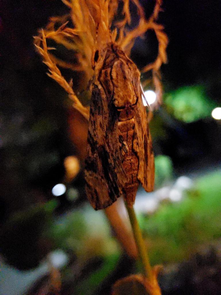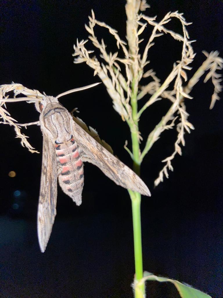 At 11pm I decided to go out once more to check and see if the moth was still there. It was! This time looking much different! The coloration was much more defined and the abdomen had shrunk some, as well as the wings extending to cover the abdomen. For sure, this looked just like a photo I had seen online of a hawkmoth. Light and dark grey striped body and wings, with pink areas on the hindwing. I called up a neighbor who is really into insects and she came over to see it. As she approached, the moth was vibrating it’s wings and took off into the air and flew into some vegetation across the street. It was really a treat to see this first flight of a newly emerged moth. We wished it good luck and I silently invited it back to the garden to lay eggs on the sweet potatoes to start the next generation.