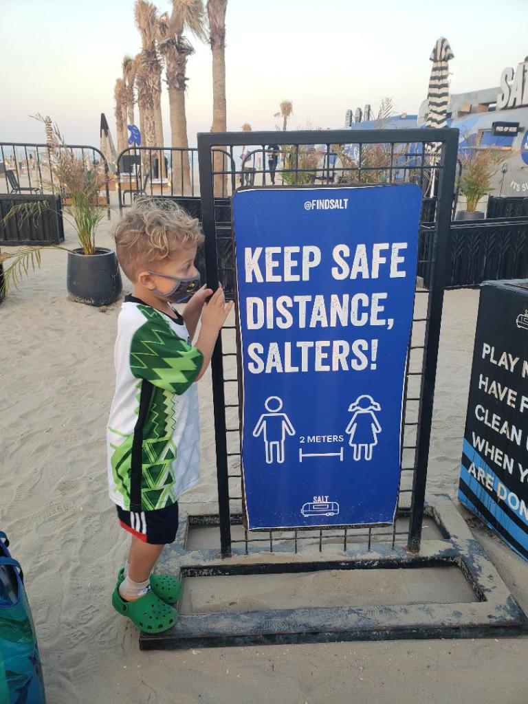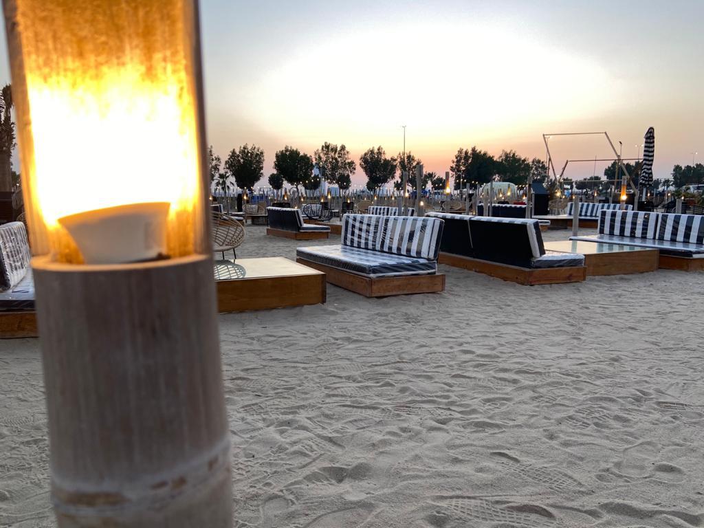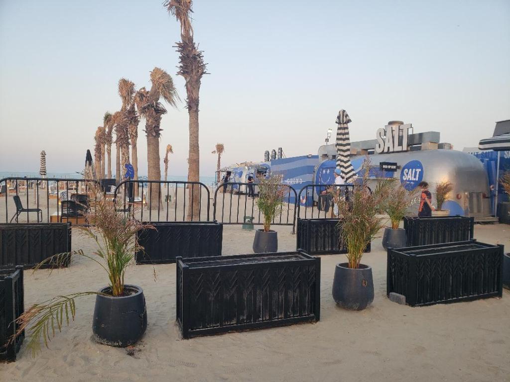 They have about 20 tables arranged on the beach. For an unobstructed view, choose the seats closest to the water. The downside is that you will have no light once the sun sets, but maybe that doesn’t matter. I loved where we sat. Next to a palm tree, we had two sofa benches and one chair. Light sticks surrounded us so we could see our area well. The cool design for lighting that SALT has, are lightbulbs put into bamboo poles. They add an element of rustic charm and tropical feel to the spot. At night it looks as though there are camp fires on sticks, or stars in the dark. It is a very comfortable place. You must wear your mask when ordering on line and walking in and out, but when you are seated, or by the beach, you can remove it.