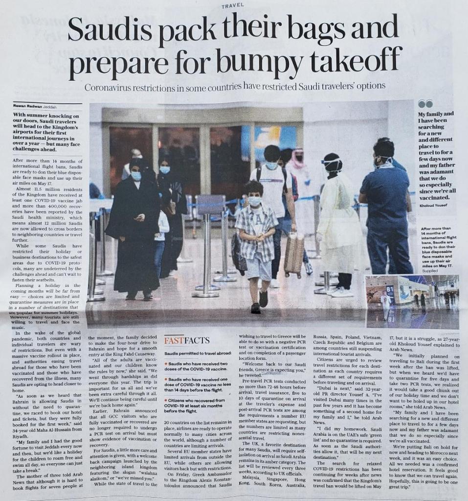 This article was front page news today in the Arab News paper. “Saudis pack their bags and prepare for bumpy takeoff”, written by Rawan Radwan for Arab News, 16 May 2021. While expats and residents could resume international travel last October, Saudi citizens were still grounded. Saudis have been restricted in their travel for over a year, since the coronavirus pandemic arrived last spring. With the end of Ramadan and Eid holiday celebrations, international travel is once more possible.
