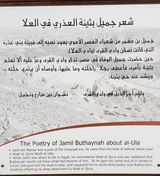 “Jamil ibn Mamar was a poet of the Umayyad era. He came from the tribe of Udhrah which lived in Wadi-al-Qura (Wadi al-Ula). When Jamil was about to die in Egypt, he remembered Wadi al-Qura and was saddened that Buthaynah would not know what had become of him. So he gave his camel and all it carried to a man, and gave him his cloak to wear, and requested him to recite some poetry near Buthaynah’s dwelling reflecting his deep attachment to Wadi al-Qura.”