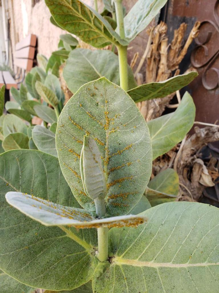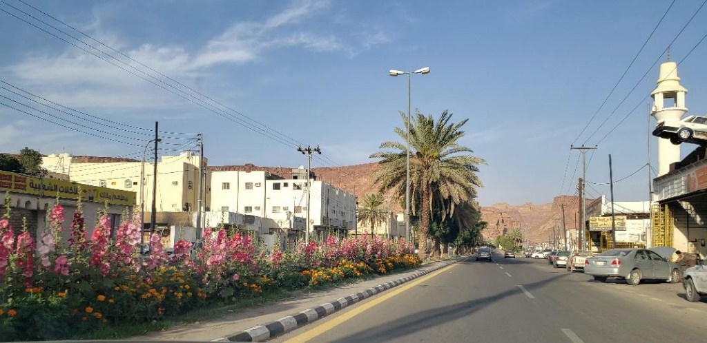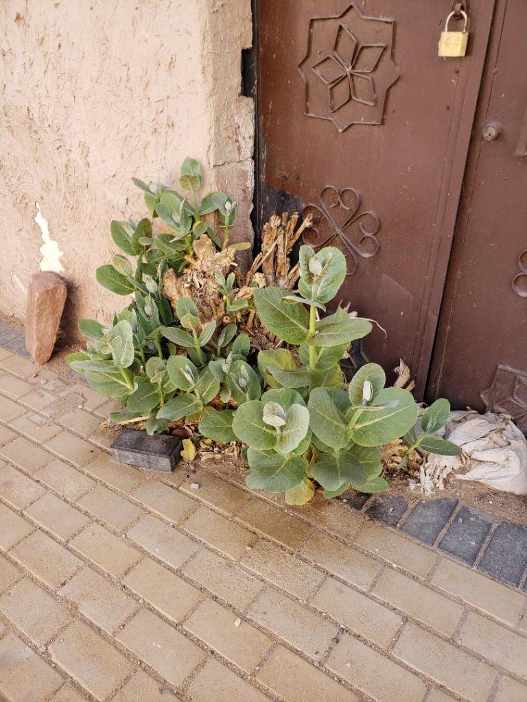 Street conditions: When walking around, just be aware that some areas are better than others. There are broken cobbles, or sidewalks with uneven terrain. Here is a native milkweed plant, growing near a doorway on the sidewalk, along with some rubbish. Notice the aphids! For the most part, AlUla has beautifully planted median strip areas, all along the highways.