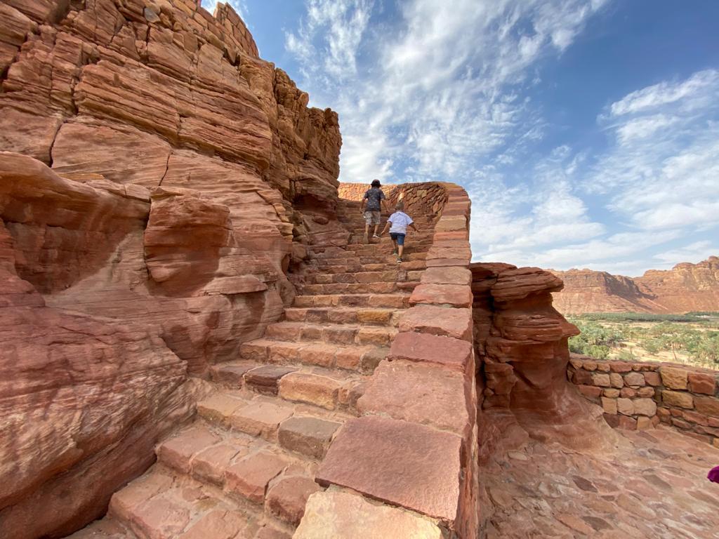 When we finished with the neighborhood tour, our guide led us down the street. We entered an area with steps that led us on a climb up to the top of a “castle” lookout. There are many steps, and my boys perked up at the chance to see who could get to the top fastest. It was a windy day, so we all watched our steps as we climbed up. There are about 3 landing areas you can rest on if you need to. You don’t have to get to the top to have beautiful views. The scenery all around is just amazing! We had a clear, sunny day with wind and clouds. If it wasn’t so windy I would have taken a video. Most of the time my hands were busy holding down my abaya and keeping my scarf from taking off into the wind!