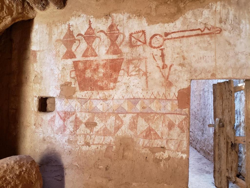 Interior design: Archaeologists are still digging at this site. We still have much to learn about the people who built this area. There are some painted walls with geometric designs. Here is one that shows household objects such as a door key, teapots and cookware. There will probably be more to see in the future, as more is discovered and uncovered at this site.