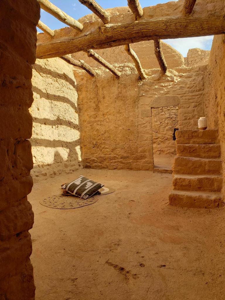 Reconstructed Homes: Built of mud bricks, palm fronds and wooden beams., every house had the same layout. A bottom living room had an area for the sheep or goat kept for milk, along with storage room in the back. Climb the stairway to the second floor that was used as a kitchen and bathroom. The only windows were on the second floor. I am not sure about sleeping arrangement, but I think they were also on the second floor, over the street. I was a bit confused on how the bathroom functioned on the second floor. Much of the town is in ruins, however you get a good sense of what it could have been like. Setting out props up such as rugs, pillows, etc. help the imagination.