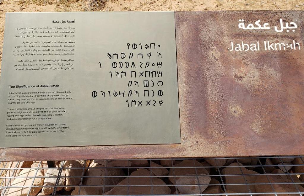 Between two areas of rocky mountain, there is a good path leading us to inscriptions carved right into the rock. Some are in relief, and in various languages. The significance of this site, is that pilgrims and travelers coming from other countries, would record messages for others here in the rock. There are instructions for who to see at the temple, (name of priestess), how to make offerings, (at Dadan temple site), etc. The photo below gives an idea of the language style found inscribed in the stone. As quoted from the sign, “Most of the inscriptions are written in Dadanitic, whose alphabet was written from right to left, with 28 letter forms. A vertical line or two dots placed on top of each other were used to separate words.” If you want to read more about this language specifically, click on this link to Wikipedia: https://en.wikipedia.org/wiki/Dadanitic